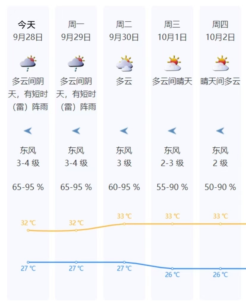 【周日天气】多云间阴天,间中有短时(雷)阵雨,东风加大。